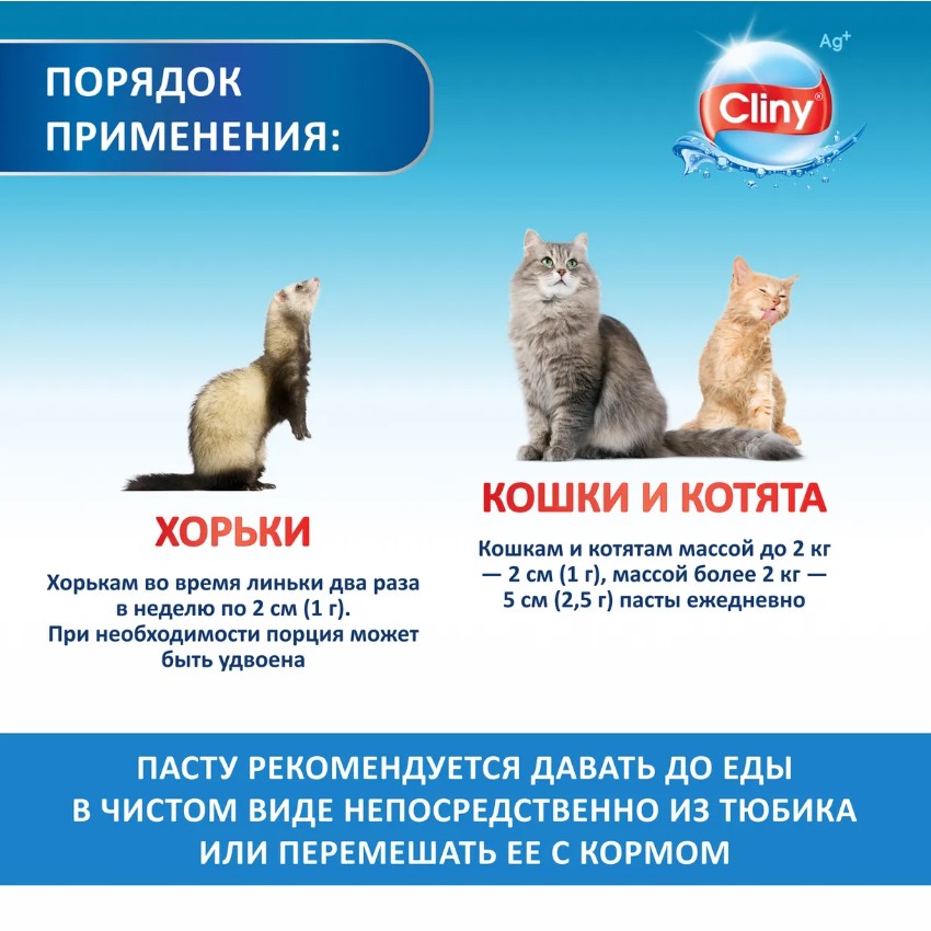 Давайте пасту в чистом виде непосредственно из тюбика или перемешайте её с кормом. Кошкам и котятам массой до 2 кг — 2 см (1 г), массой более 2 кг — 5 см (2,5 г) пасты ежедневно. Хорькам во время линьки два раза в неделю по 2 см (1 г).