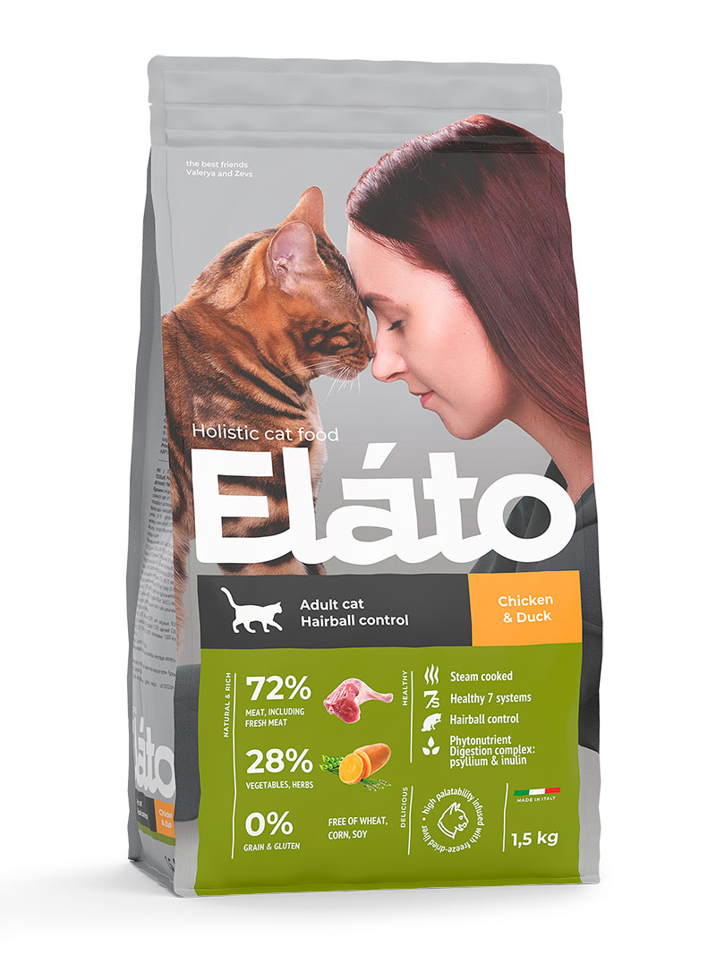 Elato Holistic – полнорационный корм для взрослых кошек с курицей и уткой / для выведения комочков шерсти из желудка и кишечника кошек