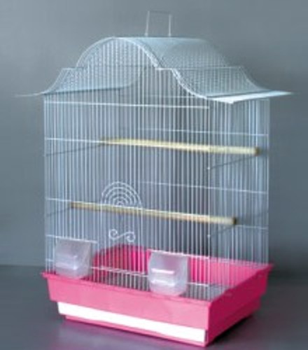 Просторная клетка для птиц, высокий поддон, в комплекте с двумя внутренними кормушками и деревянными жердочками.