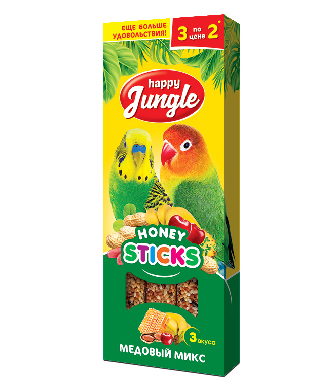 Зерновые палочки Happy Jungle - медовое лакомство для попугаев и декоративных птиц с ягодами, орехами и тропическими фруктами. 3 разных вкуса максимально разнообразят рацион, а также помогут определиться в предпочтениях птицы.