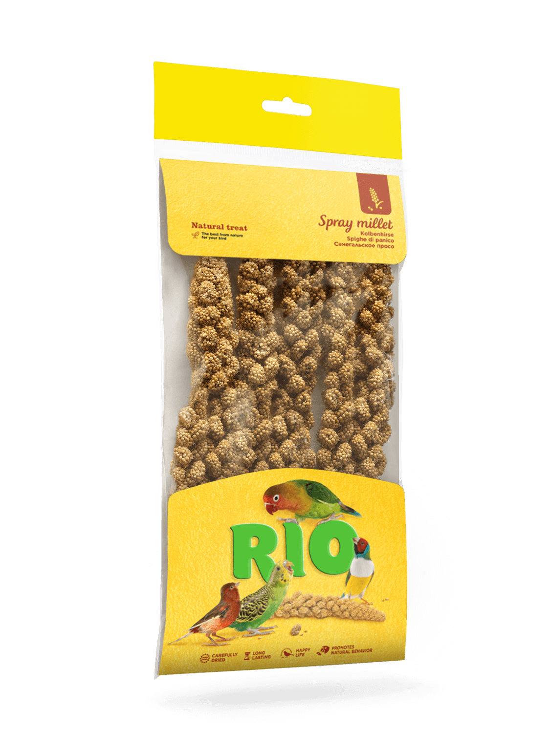 Сенегальское просо RIO (РИО) в колосьяхКолосковое просо является самым любимым лакомством для попугайчиков, канареек, амадин и других видов птиц. Подобно птицам, живущим в природе, домашние пернатые с огромным удовольствием выклевывают зерна из натуральных соцветий. При этом, благодаря естественной сохранности и тонкой шелухе зернышки из колосьев лучше усваиваются организмом птицы. Это особенно важно для подкармливания птенцов, больных птиц, а также птиц перед периодом размножения. Кроме того, просо в колосьях – это еще и прекрасная возможность занятий и физических упражнений для птицы.