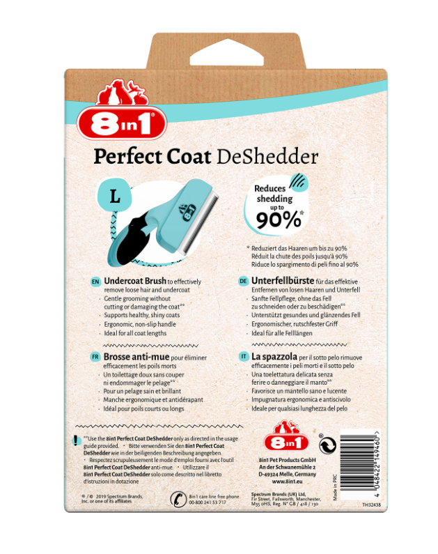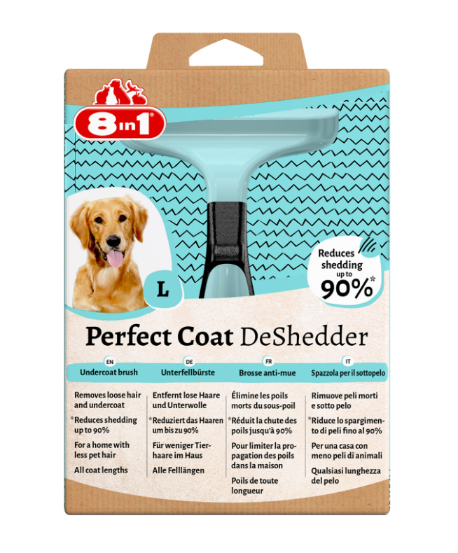 Дешеддер 8in1 Perfect Coat L для крупных собак. Лезвие дешеддера захватывает и вытаскивает слабо прикрепленные волоски подшерстка еще до их выпадения, сокращая линьку собаки до 90%. Благодаря дешеддеру 8in1, вы забудете о выпавшей шерсти в доме, а ваш питомец будет выглядеть ухоженно. При правильном применении дешеддер 8in1 эффективен на всех животных, обладающих подшерстком, в независимости от длины шерсти. Инструкция: Вычёсывайте собаку, проводя дешеддером по направлению роста волос, проникая лезвием вглубь шерсти животного. Не задерживайтесь надолго в одной области. Дешеддер 8in1 следует использовать только на животных, обладающих подшерстком.