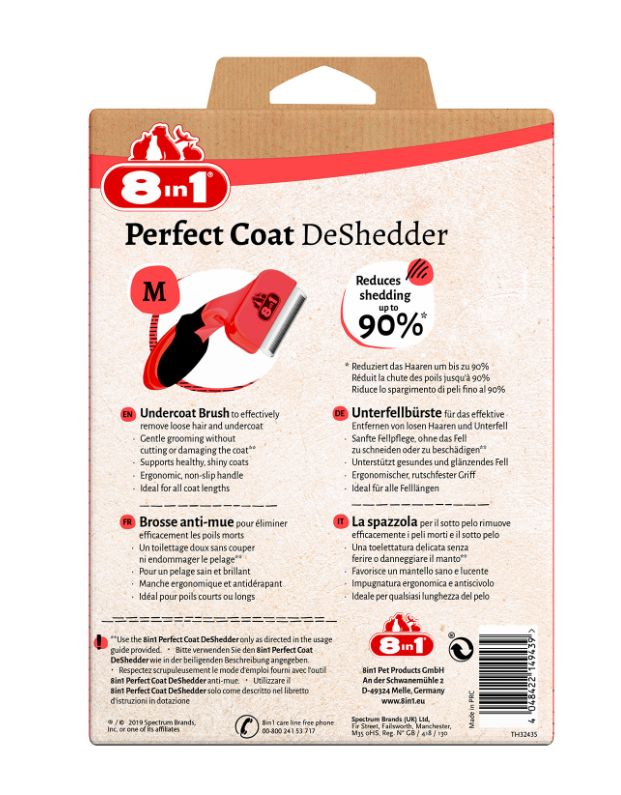 Дешеддер 8in1 Perfect Coat M для собак. Лезвие дешеддера захватывает и вытаскивает слабо прикрепленные волоски подшерстка еще до их выпадения, сокращая линьку собаки до 90%. Благодаря дешеддеру 8in1, вы забудете о выпавшей шерсти в доме, а ваш питомец будет выглядеть ухоженно. При правильном применении дешеддер 8in1 эффективен на всех животных, обладающих подшерстком, в независимости от длины шерсти. Инструкция: Вычёсывайте собаку, проводя дешеддером по направлению роста волос, проникая лезвием вглубь шерсти животного. Не задерживайтесь надолго в одной области. Дешеддер 8in1 следует использовать только на животных, обладающих подшерстком.