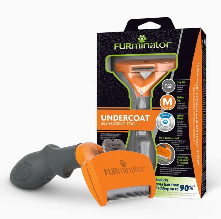 Инструмент FURminator (Фурминатор) M - 62 мм (длина рабочей поверхности).Отлично подойдет для средних собак (9-23 кг) с длинной шерстью (более 5см). Уникальное лезвие захватывает и вытаскивает мертвые волоски подшерстка до их выпадения, сокращая линьку до 90%. Инструмент экономит ваше время, сохраняет здоровье кожи и шерсти, не повреждает остевой волос. Вы забудете о выпавшей шерсти на полу, одежде и мебели. Кнопка самоочистки легко сбрасывает шерсть с инструмента. Защелкните ее для защиты в процессе хранения. Защитные края предупреждают давление на кожу.