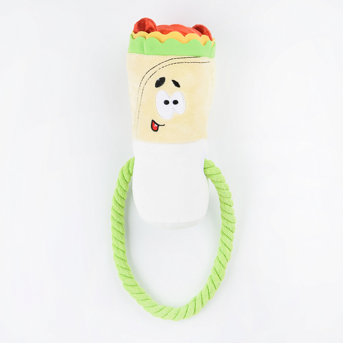 Игрушка Mr.Kranch для собак "Шаурма" плюшевая с канатиком и пищалкой. Уникальное сочетание высокопрочных гипоаллергенных материалов и стильного дизайна. Для привлечения большего интереса питомца, спрячьте любимые лакомства или корм в складки игрушки. 100% натуральный хлопковый канат способствует удалению мягкого зубного налета. Размер: 21 см