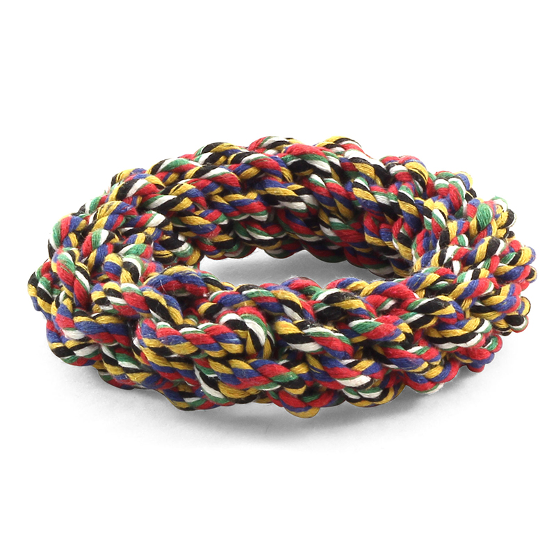 Плетеное кольцо сделано из разноцветных веревок из натурального хлопка, очень прочная игрушка. Способствует тренировке жевательных мышц у собаки.