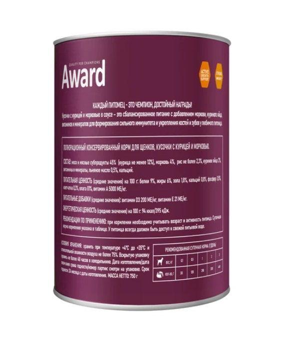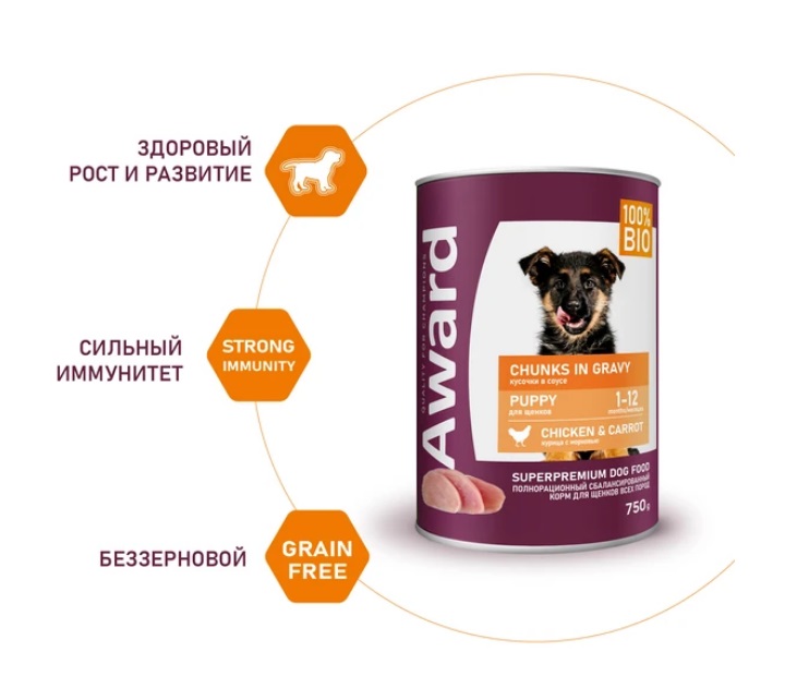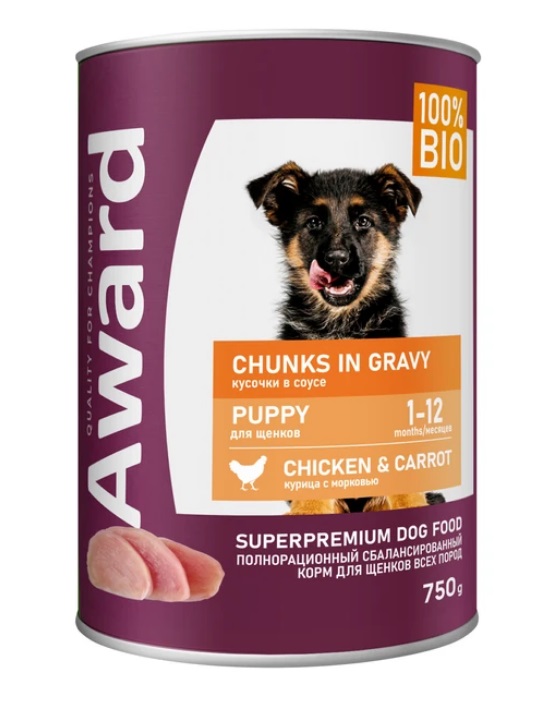 AWARD Влажный корм для щенков кусочки с курицей и морковью 750г.
