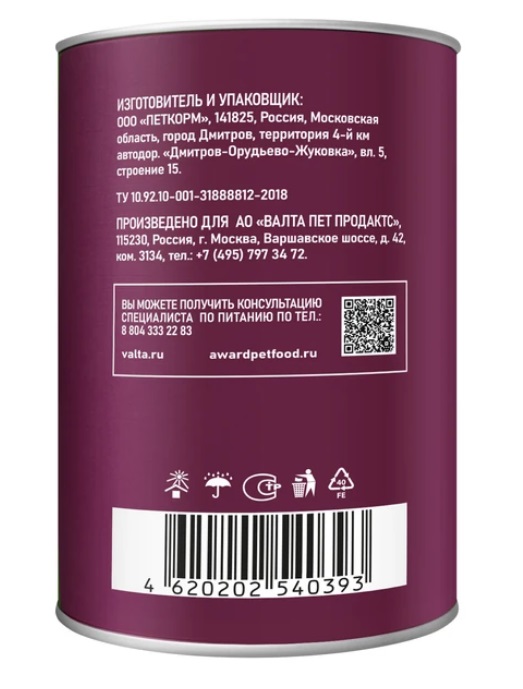 Состав: Мясо и мясные субпродукты 45% (курица не менее 12%), морковь 4 %, рис не более 2,3%, яйца кур 2%, витамины и минералы, льняное масло 0,5%, кальций.