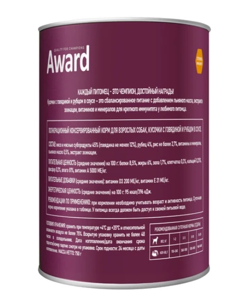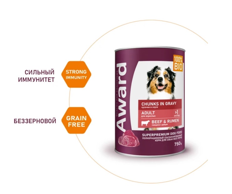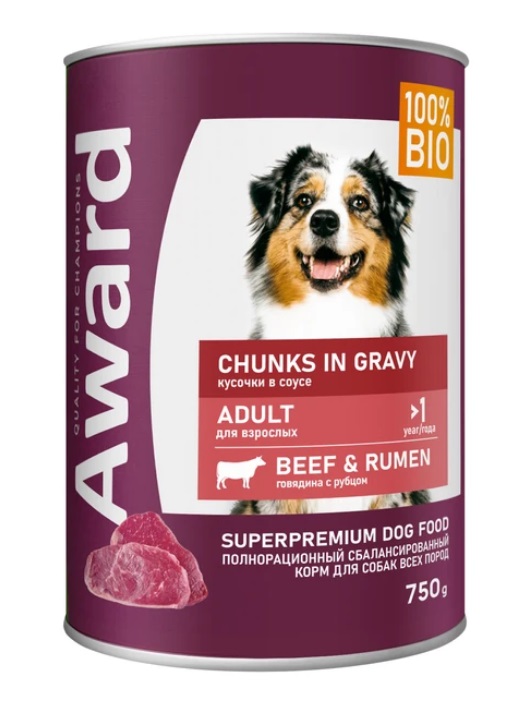 Влажный корм AWARD для взрослых собак кусочки с говядиной и рубцом в соусе 750г.