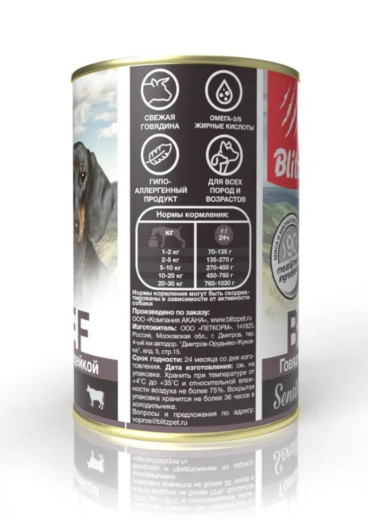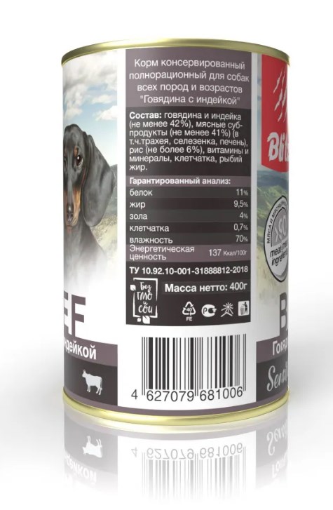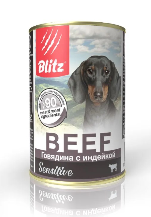 Полнорационный влажный корм для собак Blitz «Говядина с индейкой» состоит из двух видов натурального мяса, каждый из которых является не только вкусным, но и полезным.