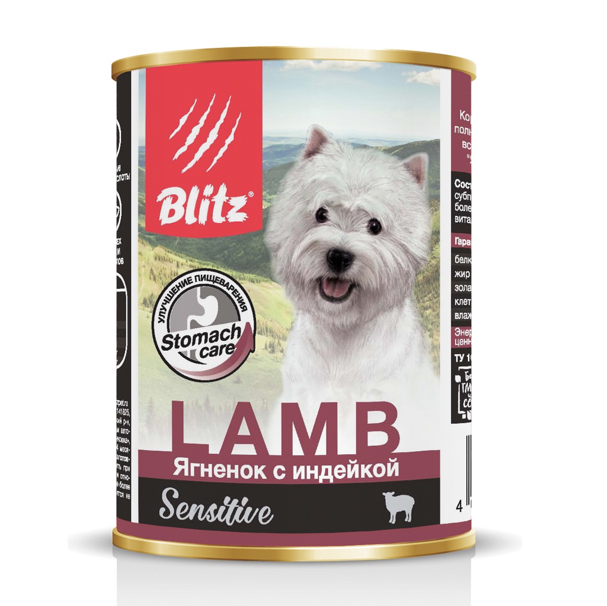 Консервы «Ягнёнок с индейкой» марки «Блиц» — это нежный мясной паштет с аппетитным ароматом и неповторимым вкусом, обогащённый полным комплексом витаминов и минералов, который непременно понравится вашей собаке!