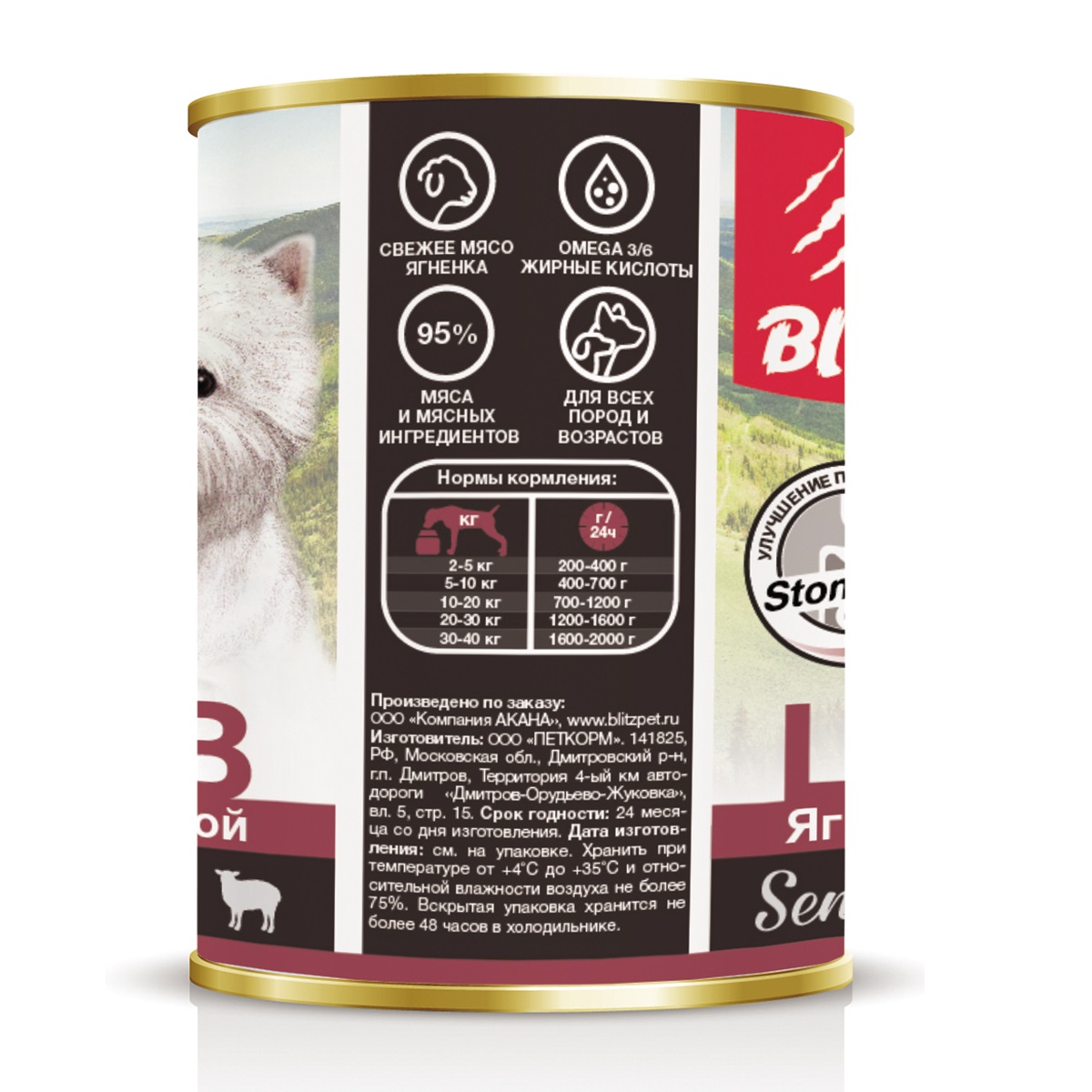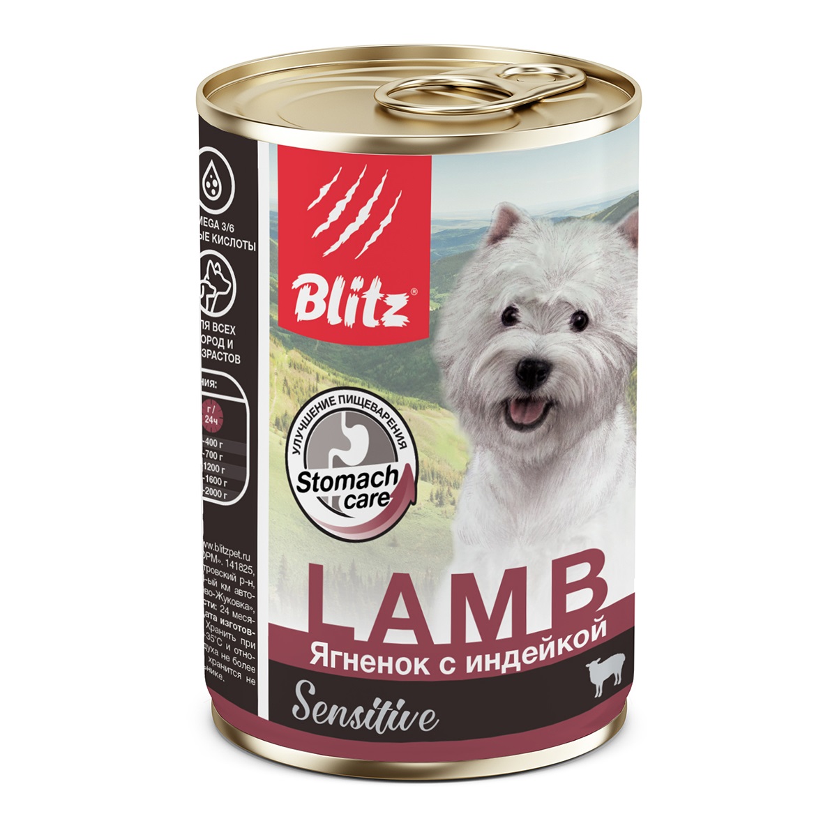 Мы учли это при создании полнорационного влажного корма Blitz для собак «Ягнёнок с индейкой», использовав в составе более 90% этого высокоусвояемого мяса, значительно реже вызывающего аллергическую реакцию, чем курица и говядина, а также очень незначительное количество риса, всего 3%.
