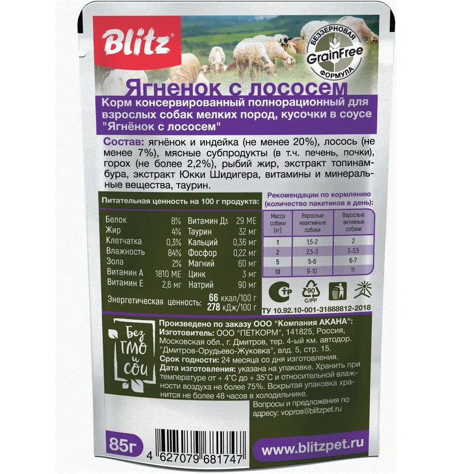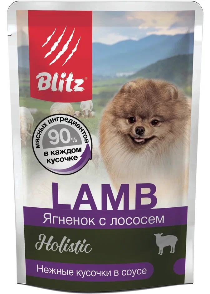 Паучи Blitz Holistic «Ягнёнок с лососем» вызовут щенячий восторг у взрослых собак и превратят приём пищи в изысканное удовольствие.