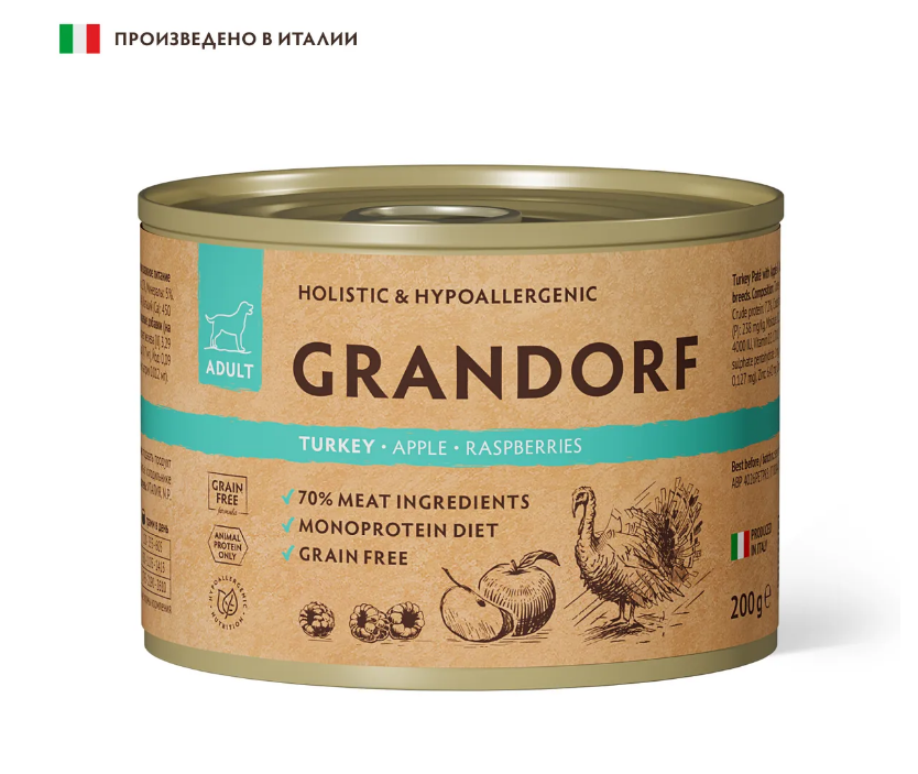Состав: Индейка (70%), Яблоки (4%), Малина (4%), Бульон (17%), Минералы (5%).