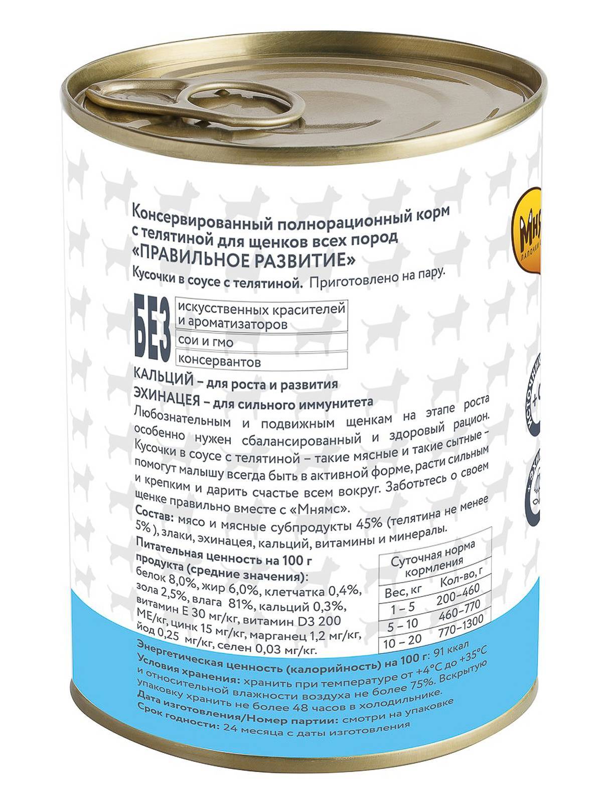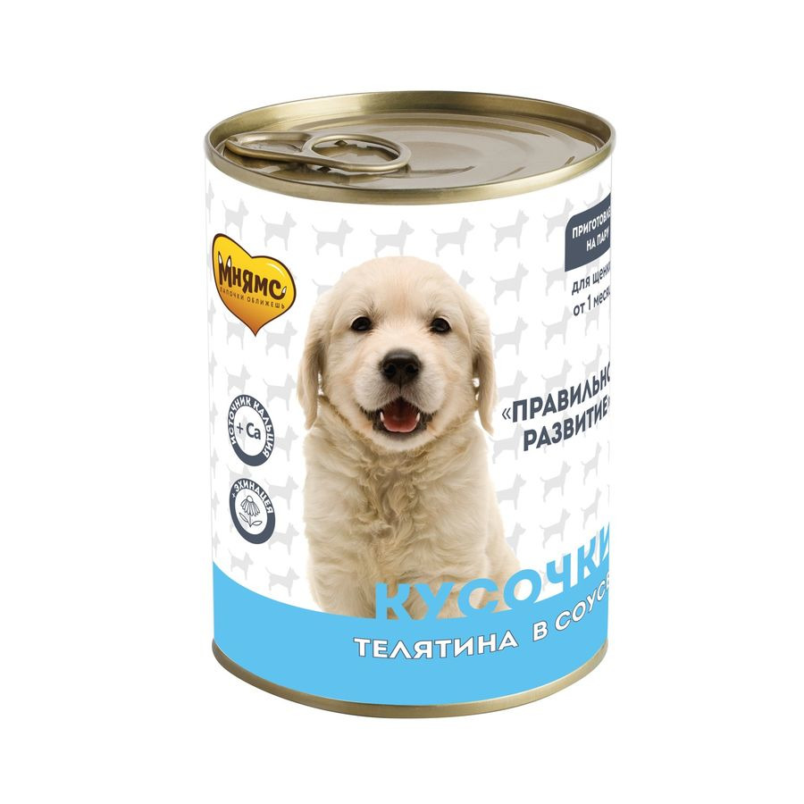 Любознательным и подвижным щенкам на этапе роста особенно нужен сбалансированный и здоровый рацион. Кусочки в соусе с телятиной – такие мясные и такие сытные – помогут малышу всегда быть в активной форме, расти сильным и крепким и дарить счастье всем вокруг. Заботьтесь о своем щенке правильно вместе с «Мнямс».