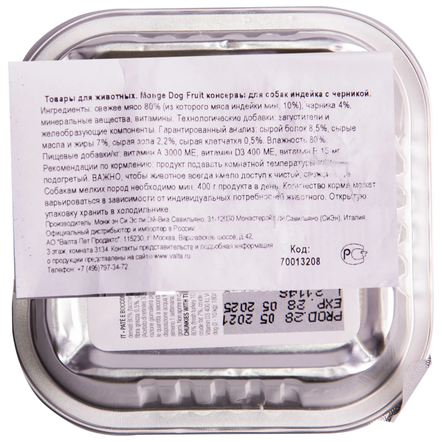 Полнорационный влажный корм Monge Dog Fruit с индейкой и черникой для взрослых собак всех пород, 100 г.