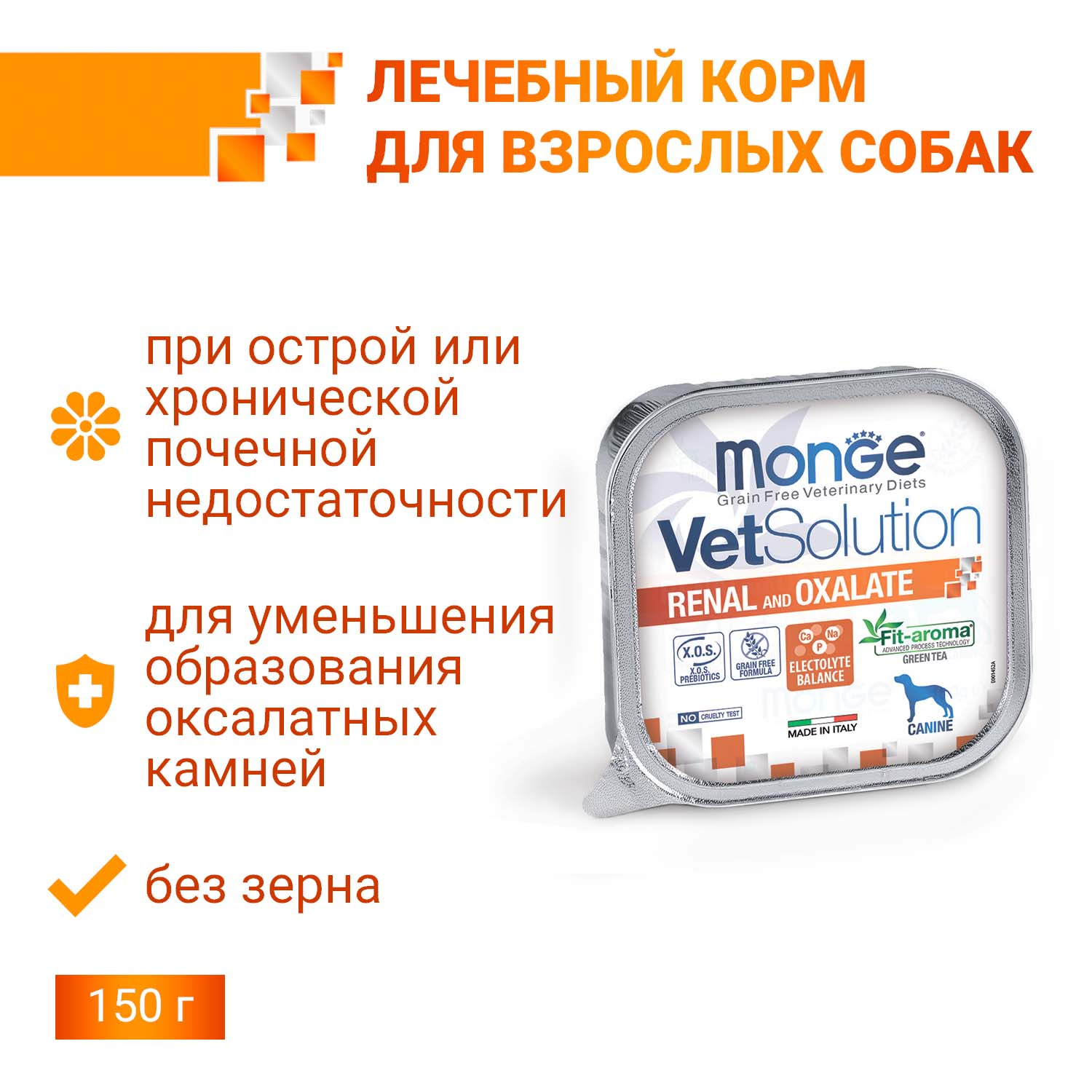 Лечебный корм Monge VetSolution Dog Renal and Oxalate Ренал и Оксалат для собак при хронической почечной недостаточности (ХПН все стадии) и профилактике образования уролитов оксалата кальция 150 г.