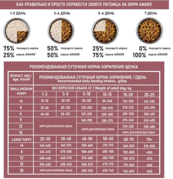 Рекомендуется вводить корм в рацион питомца постепенно в течение недели. Для сук во время беременности и лактации: рекомендуется вводить данный корм в рацион, начиная с 6-й недели беременности постепенно (минимум в течение недели).