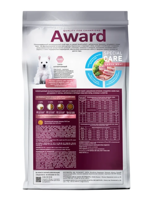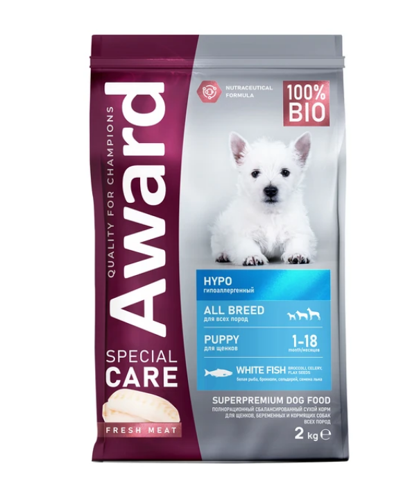 Корм Award - тщательно сбалансированная рецептура из 100% натуральных ингредиентов, созданная по инновационной формуле, обеспечивающей комплексную нутрицевтическую поддержку организма питомца.