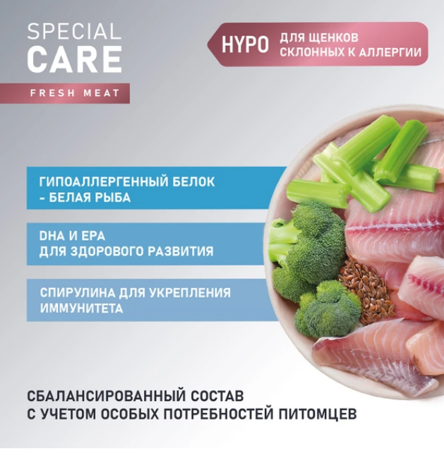 Сбалансированный полнорационный сухой корм со свежей белой рыбой с добавлением брокколи, сельдерея и семян льна - это функциональное питание для щенков, беременных и кормящих собак, которое способствует снижению риска возникновения аллергических реакций у питомцев, склонных к аллергии, улучшению состояния кожи и шерсти, а также поддержанию пищеварения, обеспечивая комплексную заботу о здоровье вашего питомца на долгие годы.