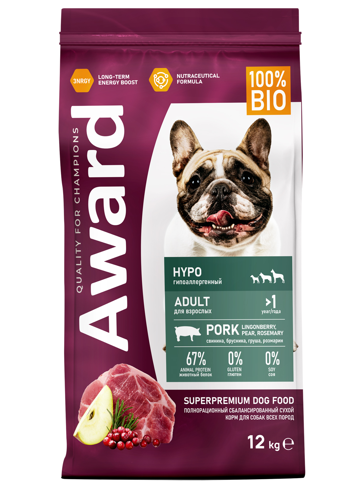 Сухой корм AWARD HYPO для взрослых собак всех пород со свининой с добавлением брусники, груши и розмарина 12 кг.