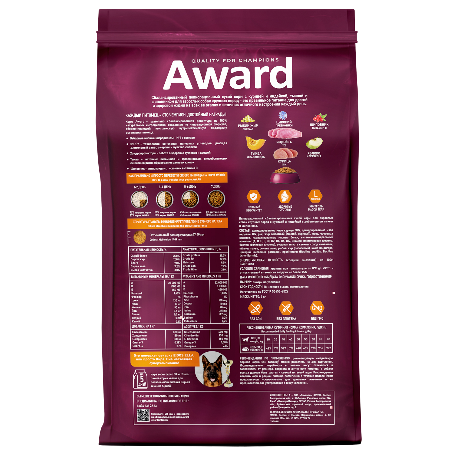 Сухой корм AWARD для взрослых собак крупных пород с курицей и индейкой с добавлением тыквы и шиповника 12 кг.