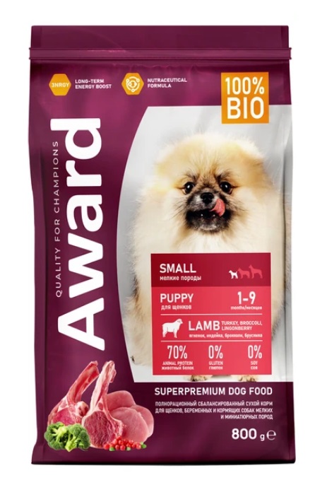 Сухой корм AWARD для щенков от 1 мес, беременных и кормящих сук мелких и мин. пород с ягненком и индейкой с добавлением брокколи и брусники 800 г.