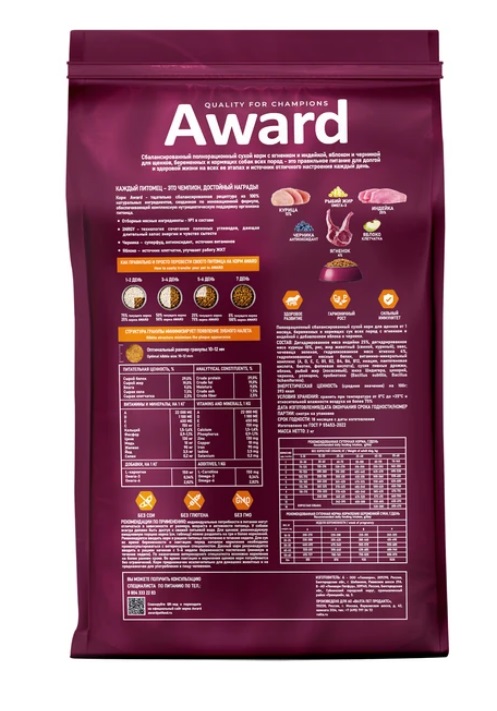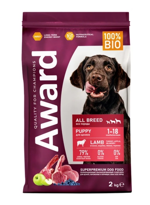 Сухой корм AWARD для щенков от 1 месяца, беременных и кормящих сук всех пород с ягненком и индейкой с добавлением яблока и черники 2 кг.