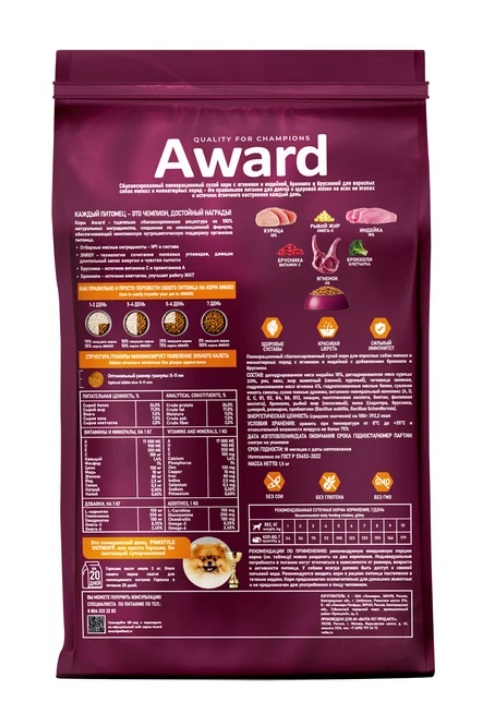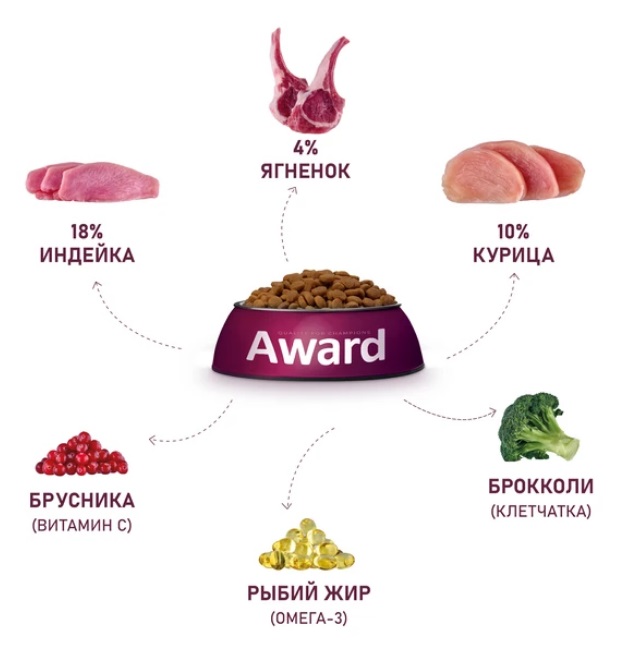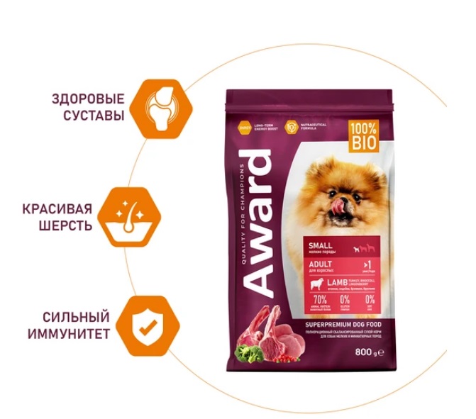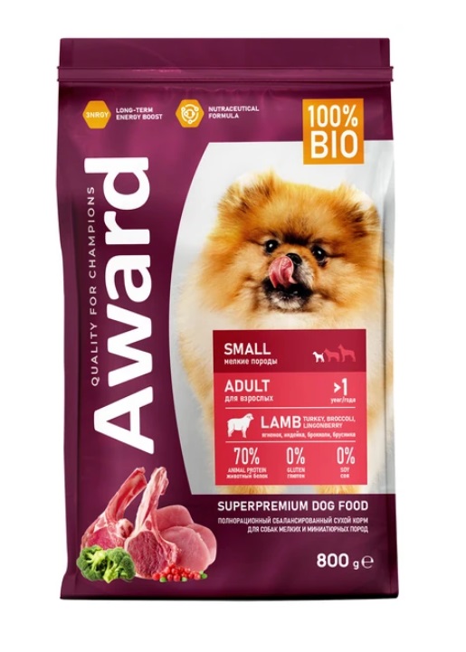 Сухой корм AWARD для взрослых собак мелких и миниатюрных пород с ягненком и индейкой с добавлением брокколи и брусники 800 г.