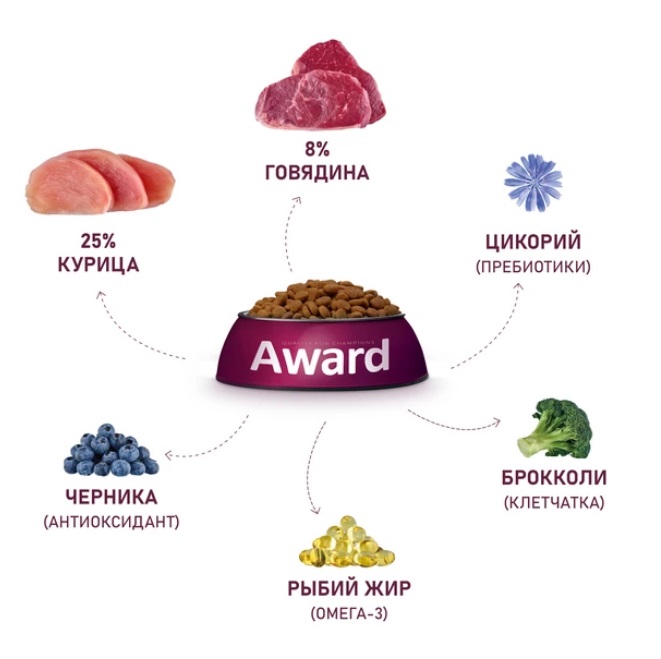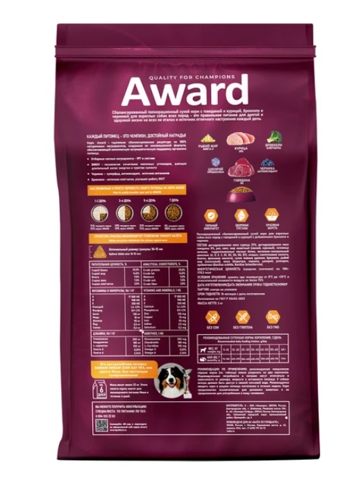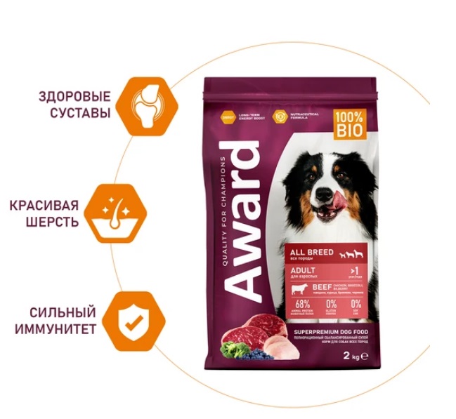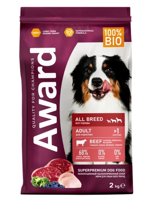 Сухой корм AWARD для взрослых собак всех пород с говядиной и курицей с добавлением брокколи и черники 2 кг.