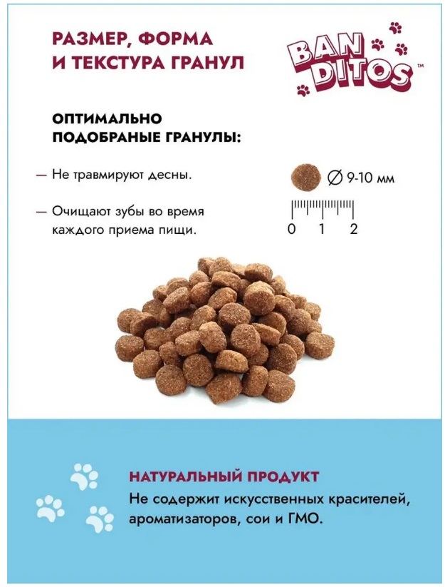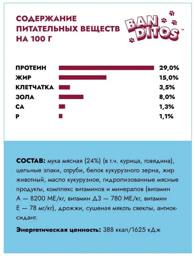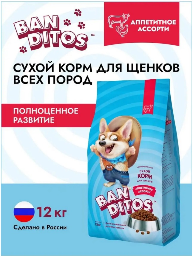 Щенячья радость и виляющий хвост — то, что делает нас счастливыми. А их — наше внимание и вкусная еда. Аппетитное ассорти из разных видов мяса — это вам не каша-малаша! Маленьким бандитам нужна уйма сил для роста и развития, а их могут дать только животные белки и жиры. В сухом корме Banditos для щенков есть и курочка, и говядина, и многое другое. А главное, он вкусный! И хрустит, и пахнет так аппетитно, что не хочется отрываться от миски! Хоть спать в ней ложись.