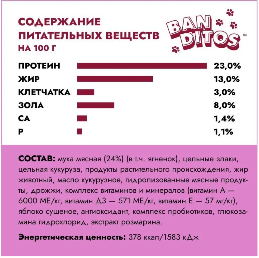 Полнорационный сухой корм BANDITOS ВКУСНЫЙ ЯГНЕНОК отличает сбалансированный состав и оптимальное содержание мясных белков, жиров, витаминов и микроэлементов, обеспечивающие все необходимые жизненные потребности взрослой собаки, а вкусовые качества удовлетворят даже самых привередливых животных.