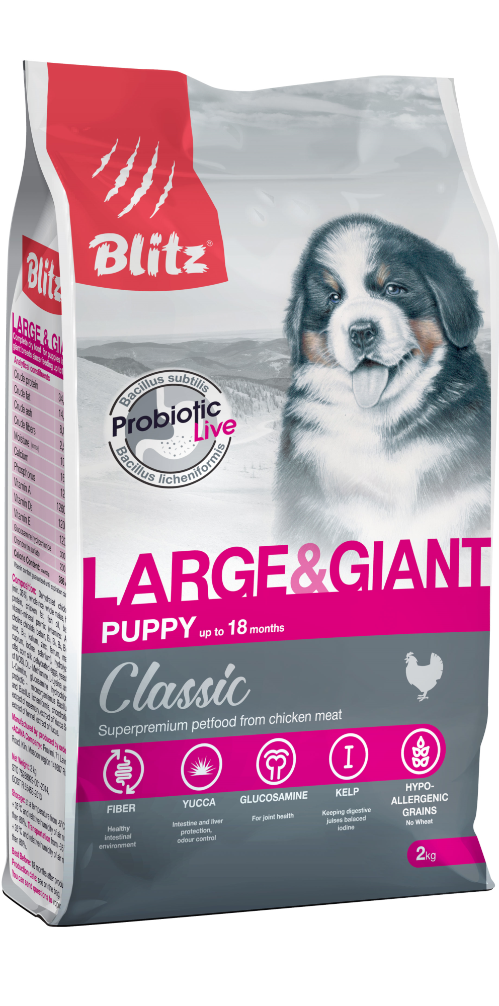 Полнорационный сухой корм суперпремиум-класса Blitz Puppy Large & Giant Breeds — лучший вариант для щенков крупных и гигантских пород собак (весом более 25 кг) в возрасте от 1,5 до 19 месяцев.