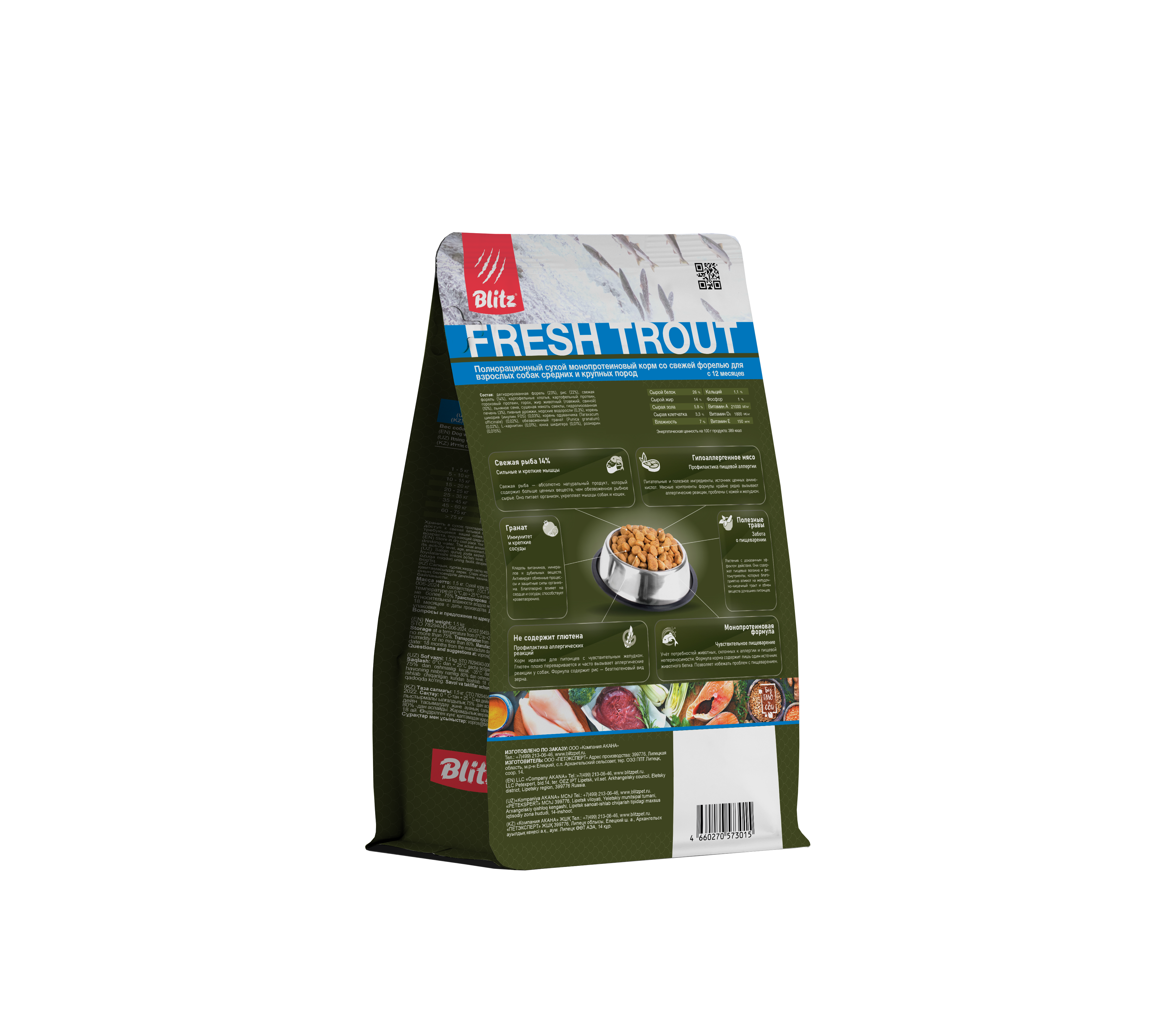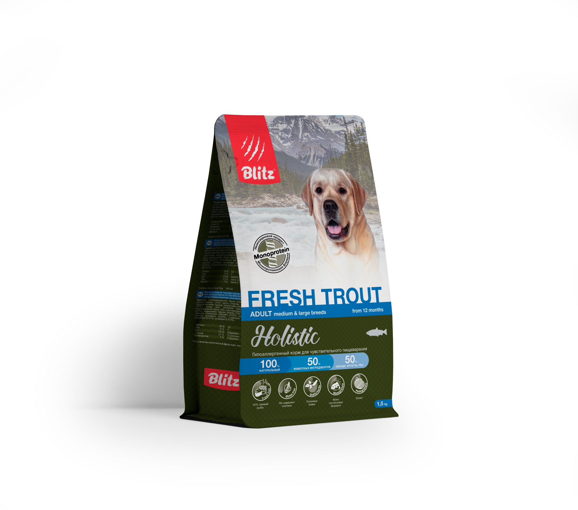 При этом форель — единственный источник животного белка в корме. К тому же эта рыба крайне редко вызывает аллергические реакции, поэтому корм Blitz Fresh Trout Medium & Large breeds Monoprotein Holistic — прекрасный выбор для собак-аллергиков.