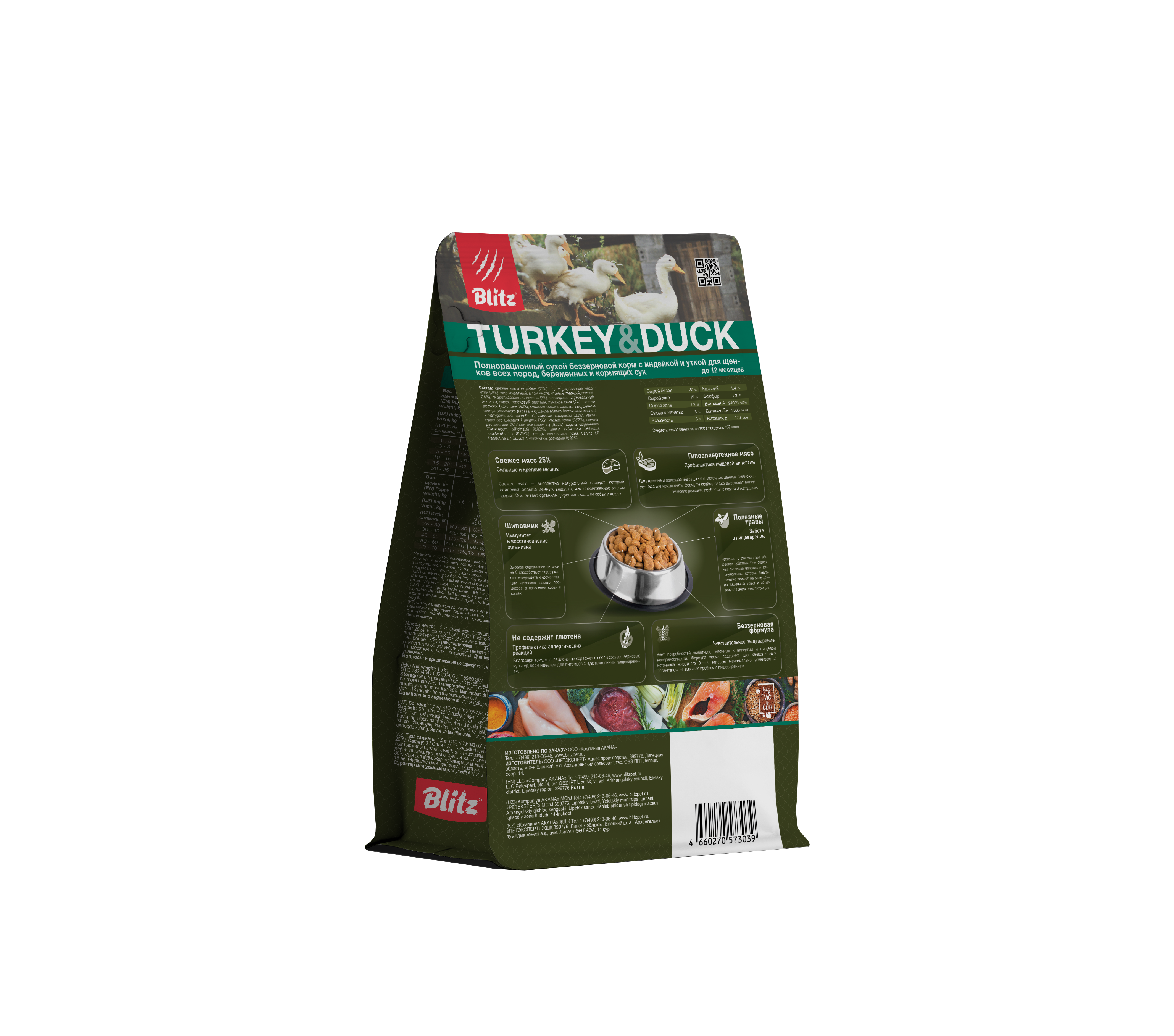 Рацион «Блиц» с индейкой и уткой подходит для кормления щенков, а также беременных и лактирующих сук.