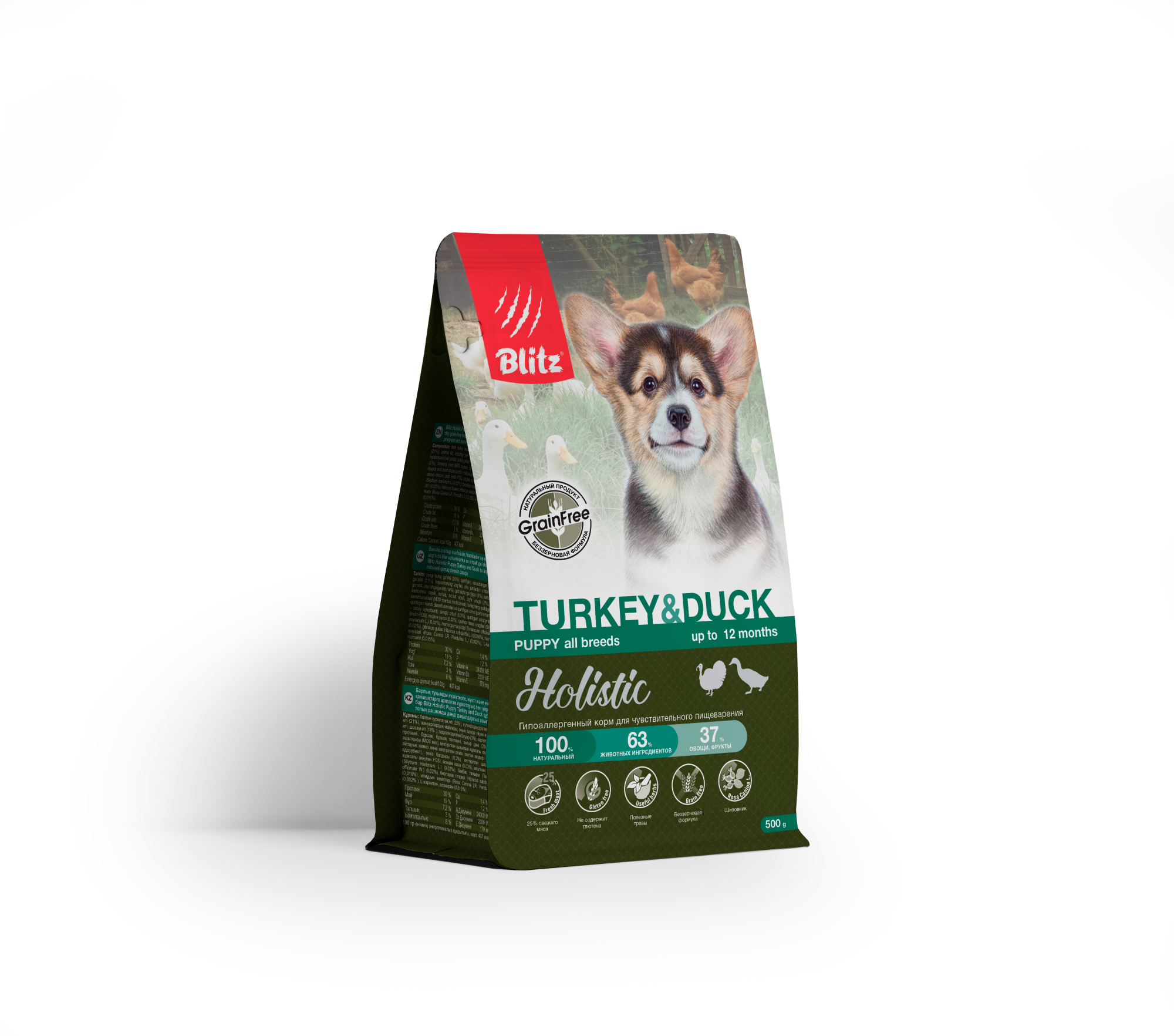 Беззерновой корм «Блиц» с индейкой и уткой для щенков подходит малышам всех пород, а особенно тем, кто отличается чувствительным пищеварением.
