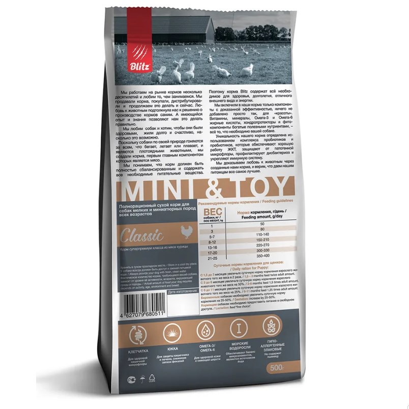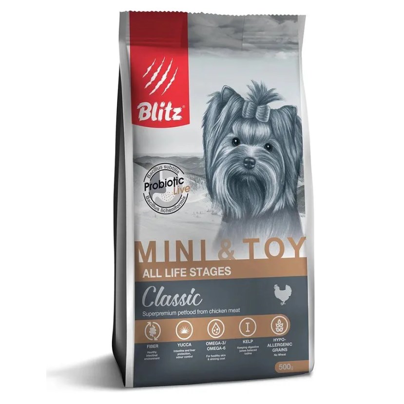 Сбалансированный сухой корм Blitz All Life Stages Mini & Toy Breeds - это суперпремиум-класс, созданный в соответствии с особыми потребностями собак мелких и миниатюрных пород (весом до 10 кг). Он не только обладает изысканным вкусом, но и содержит оптимальный баланс питательных веществ: животных белков и жиров. Уникальная формула обеспечит здоровье, энергию и долголетие вашего маленького любимца.