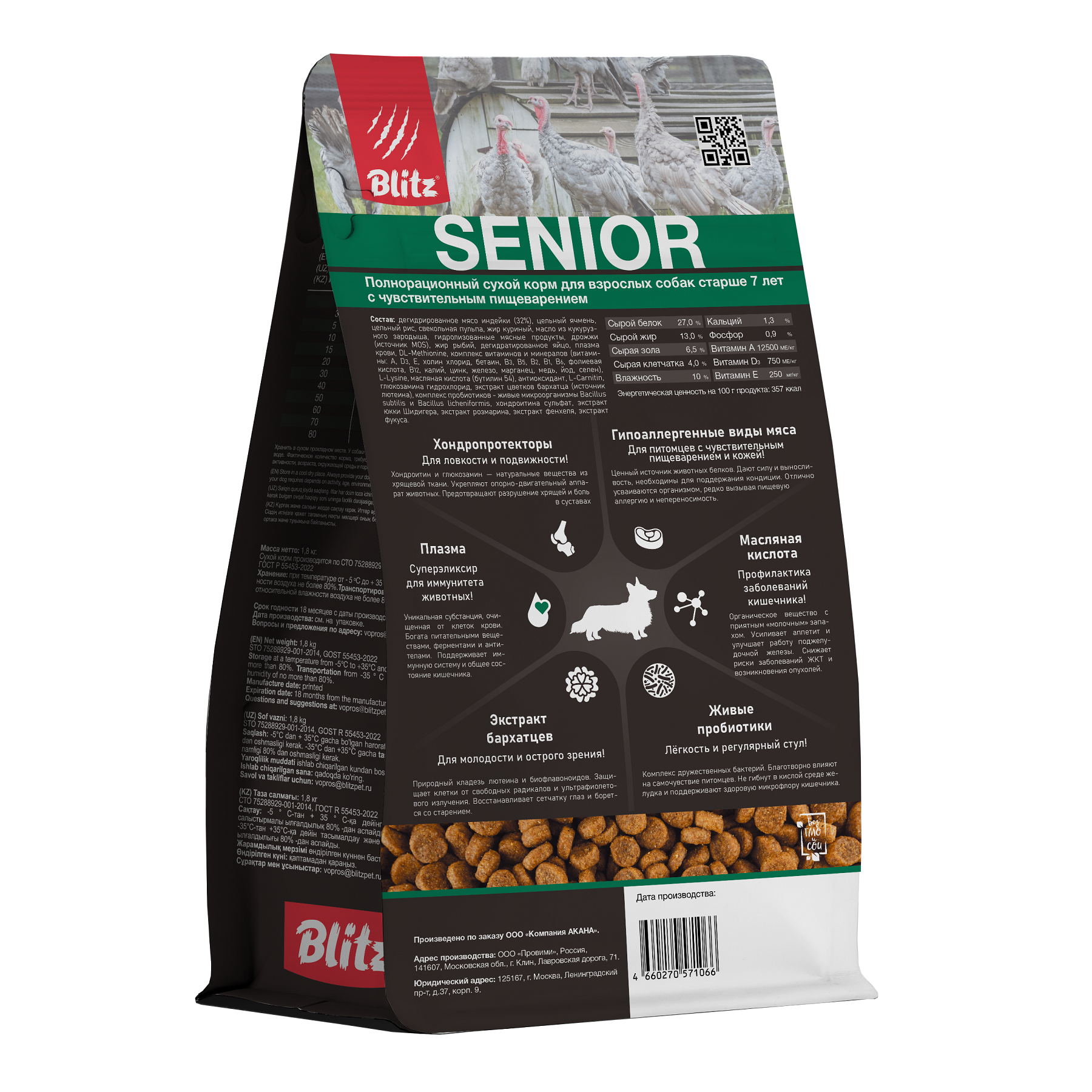 Специализированный сухой корм Blitz Sensitive Senior предназначен для питания собак, которым исполнилось 7 лет и более.