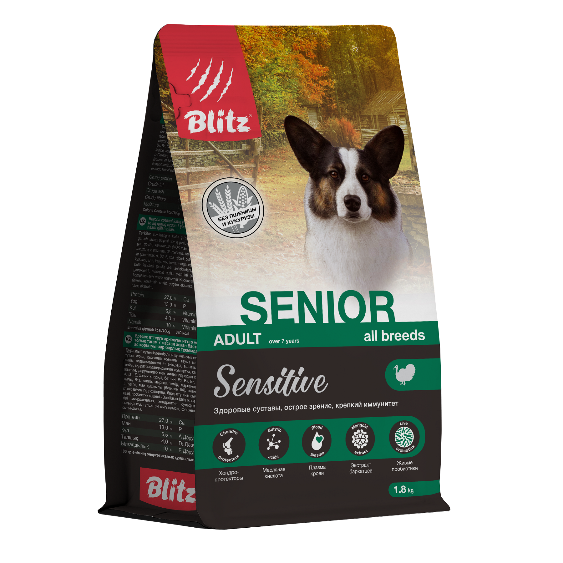Что отличает корм Blitz Sensitive для пожилых собак?