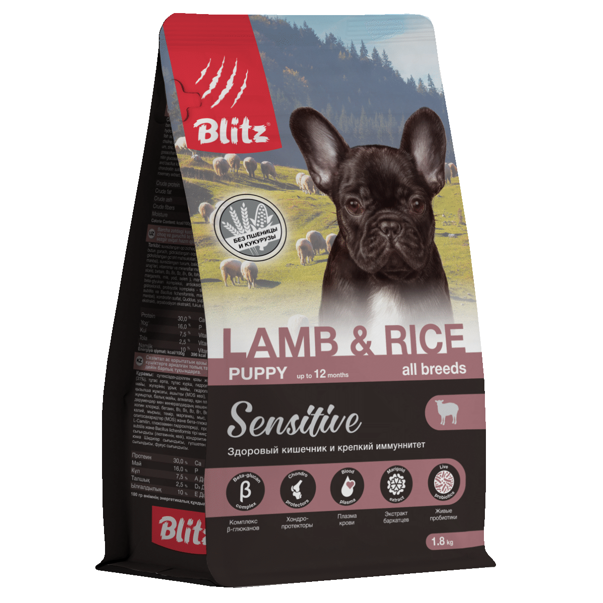 Комплексный сбалансированный сухой корм "Блиц" суперпремиум-класса с ягнёнком и рисом подходит для щенков всех пород с чувствительным пищеварением, пищевой непереносимостью или пищевыми аллергиями.