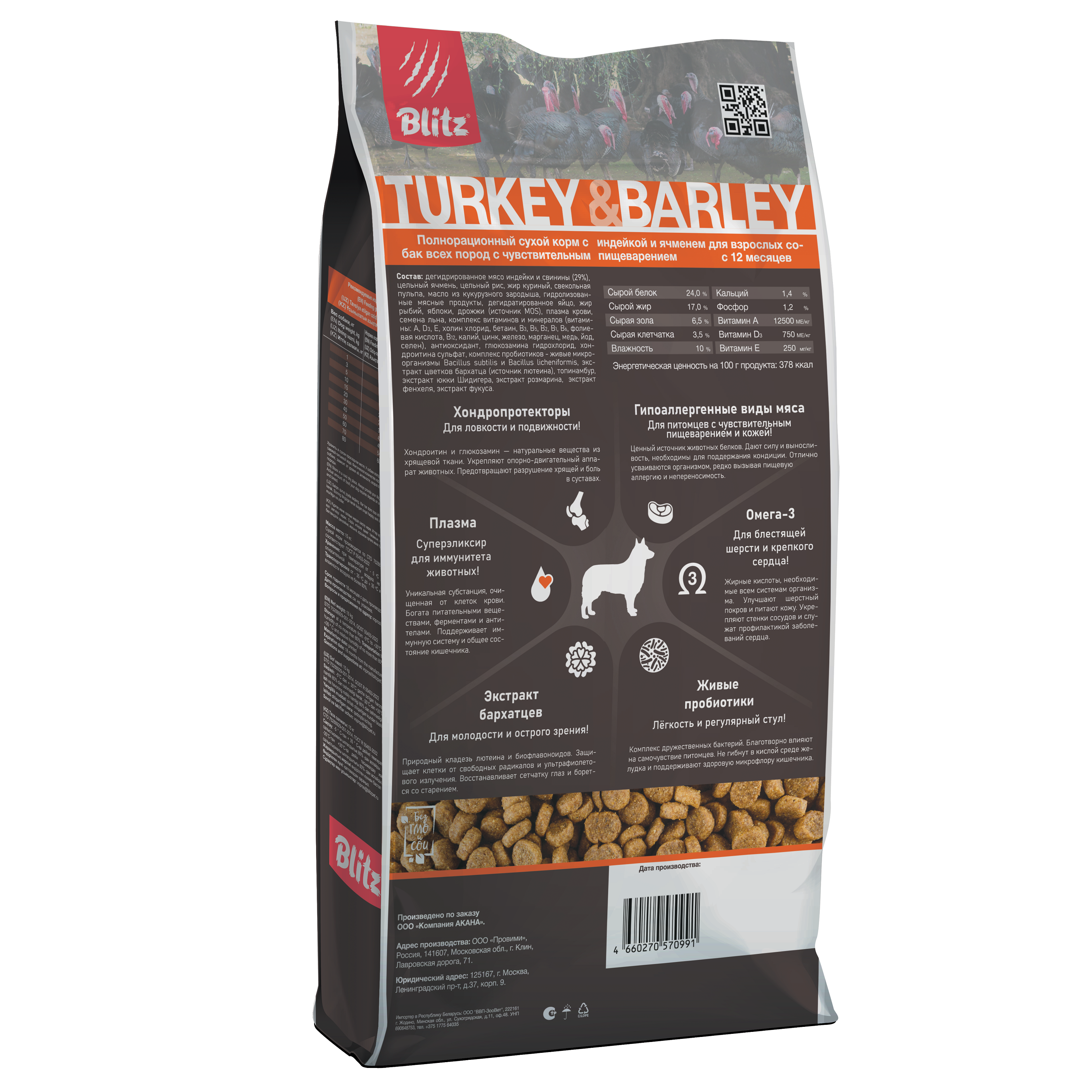 Комплексный сухой корм для собак всех пород Blitz Adult Turkey & Barley All Breeds, с индейкой и ячменём, сбалансирован по всем питательным веществам, витаминам и минералам.