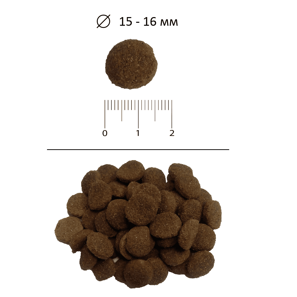 Состав:дегидрированное мясо домашней птицы (курица, индейка) (26%), цельная пшеница, цельная кукуруза, отруби, свиной жир, сушёная мякоть свеклы, гидролизованный белок, гидролизованные субпродукты, дрожжи — источник манноолигосахаридов (MOS), витаминно-минеральный комплекс (витамины: А, Д3, Е, холин хлорид, бетаин, В3, В5, В2, В1, В6, фолиевая кислота, В12, калий, цинк, железо, марганец, медь, йод, селен), сушёные яблоки, антиоксидант.