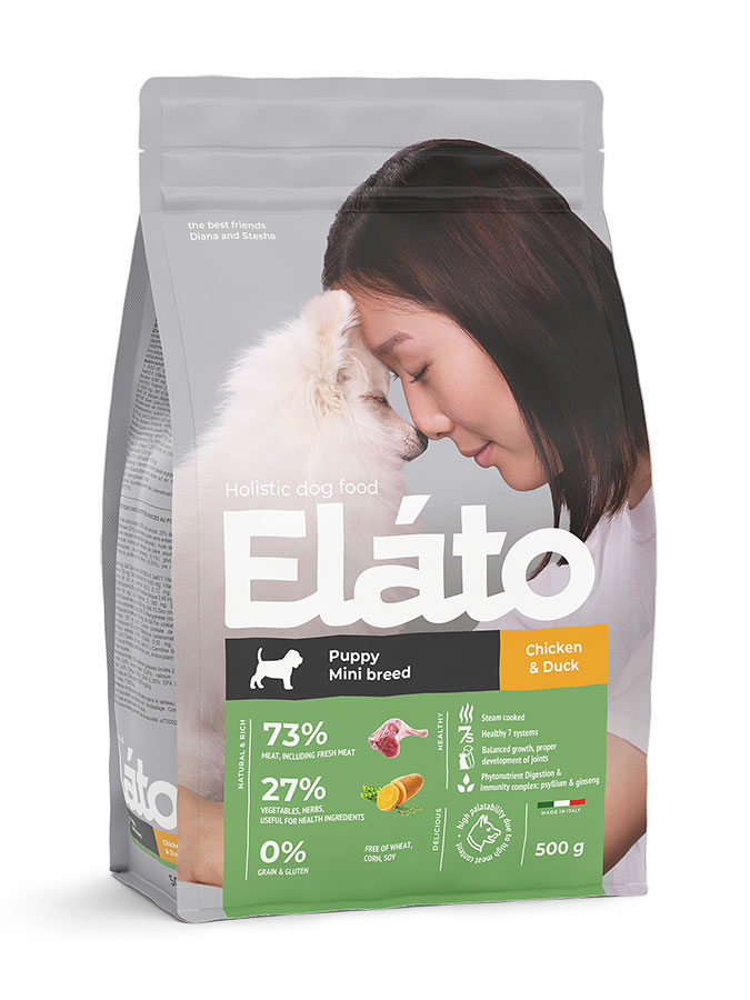Корм Elato Holistic для щенков мелких пород с курицей и уткой способствует сбалансированному росту щенков, правильному формированию суставов и костей за счет глюкозамина, хондроитина, минералов и витамина D3, содержит женьшень, псиллиум и полный комплекс витаминов для активного укрепления иммунитета.