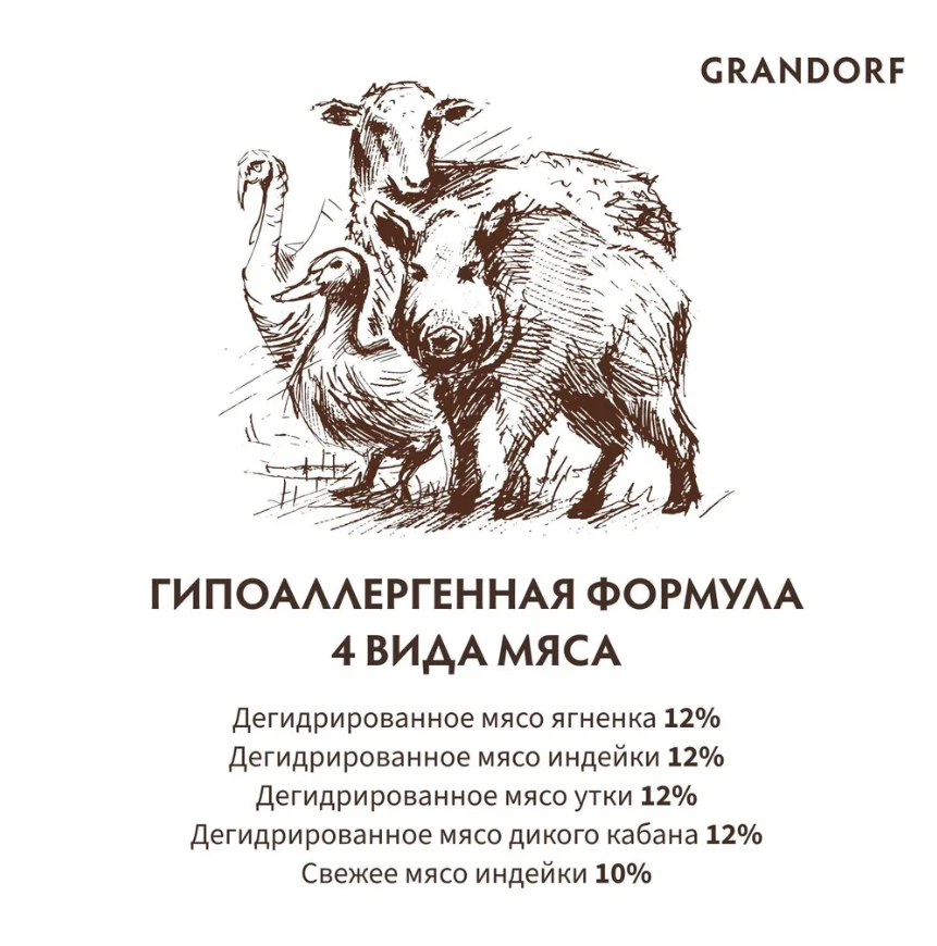 Состав: Дегидрированное мясо ягненка (12%), Дегидрированное мясо индейки (12%), Дегидрированное мясо утки (12%), Дегидрированное мясо дикого кабана (12%), Цельнозерновой коричневый рис, Свежее мясо индейки (10%), Жир индейки (5%), Сушеный батат, Свежее масло лосося (1%), Порошок корней цикория (натуральный источник пребиотиков: FOS и инулин), Сушеный антарктический криль (натуральный источник ЭПК и ДГК, 1%), Сушеное яблоко, Мука из плода рожкового дерева, Пивные дрожжи (природный источник MOS и бета-глюканов), Глюкозамин (1500 мг/кг), Хондроитина сульфат (1000 мг/кг), MSM (метилсульфонилметан, 40 мг/кг), Сушеная клюква, юкка Мохаве.