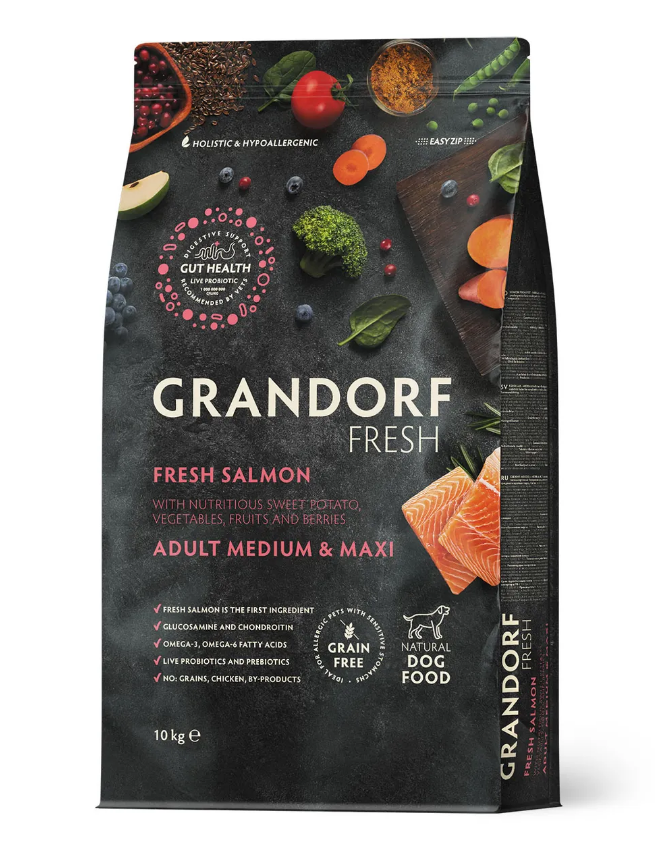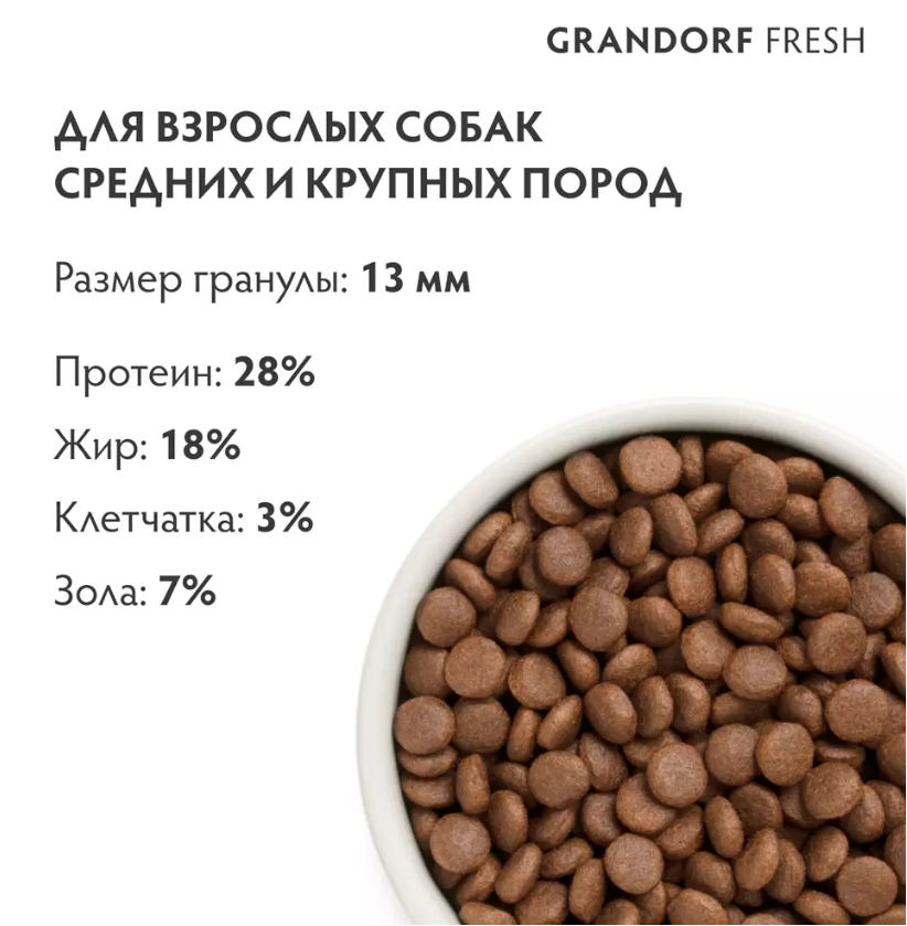 Каждый рацион Grandorf Fresh содержит один миллиард живых и полезных пробиотиков на один килограмм корма. Пробиотики поддерживают микрофлору кишечника, помогают усвоению питательных веществ и укрепляют иммунитет.