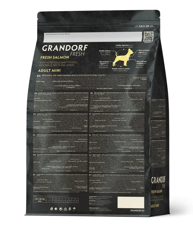 Состав: Свежий бескостный лосось (26%), Дегидрированное мясо индейки (19%), Батат, Горох, Жир индейки (6%), картофель, Порошок корней цикория (натуральный источник пребиотиков: FOS и инулин), Минералы, Льняное семя, Яблоки, Морковь, Пивные дрожжи (природный источник MOS и бета-глюканов), Масло лосося (0,5%), Клюква, Черника, Брокколи, Шпинат, Помидоры, Глюкозамина гидрохлорид (100 мг/кг), Хондроитина сульфат (100 мг/кг), юкка Шидигера, Грейпфрут, Розмарин, Куркума.