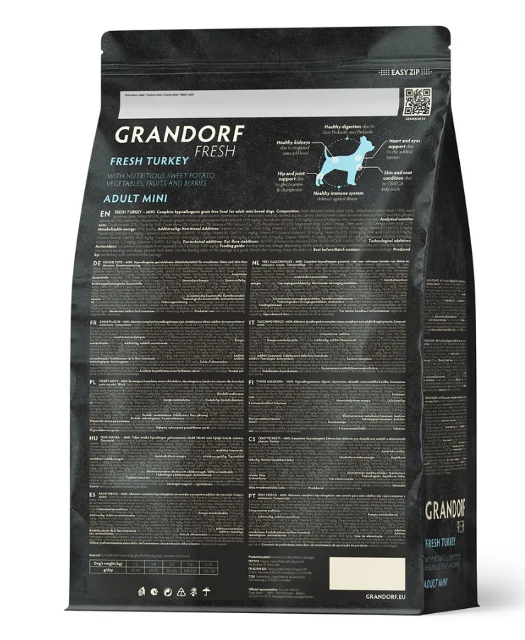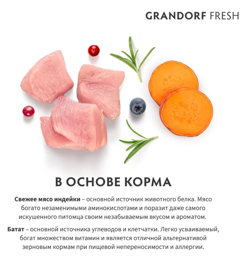 Состав: Свежее бескостное мясо индейки (26%), Дегидрированное мясо индейки (18%), Батат, Горох, Жир индейки (6%), картофель, Порошок корней цикория (натуральный источник пребиотиков: FOS и инулин), Минералы, Льняное семя, Яблоки, Морковь, Пивные дрожжи (природный источник MOS и бета-глюканов), Масло лосося (1%), Клюква, Черника, Брокколи, Шпинат, Помидоры, Глюкозамина гидрохлорид (100 мг/кг), Хондроитина сульфат (100 мг/кг), юкка Шидигера, Грейпфрут, Розмарин, Куркума.