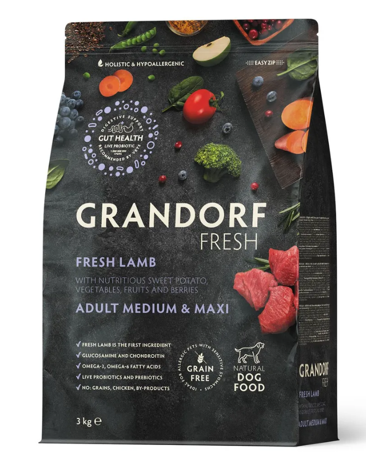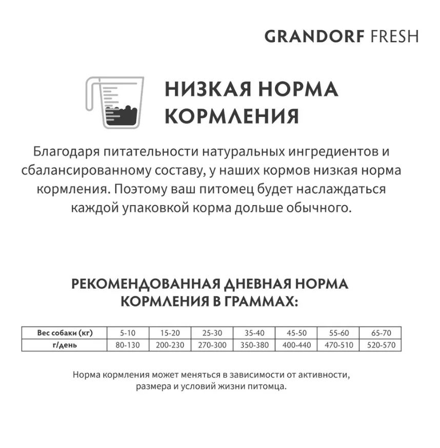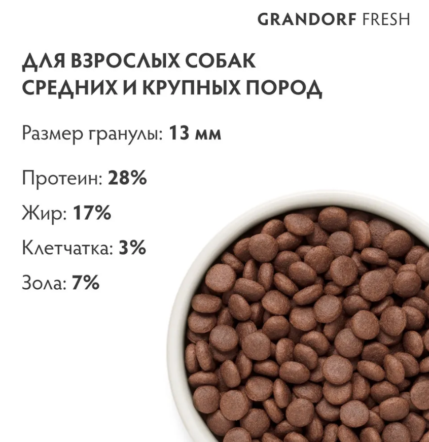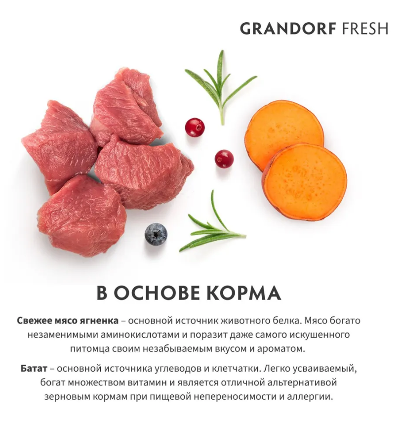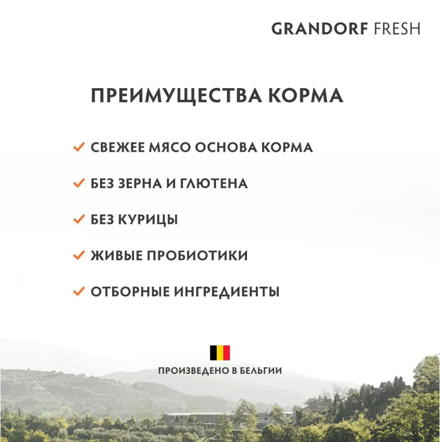 Благодаря беззерновому и безглютеновому составу корма Grandorf FRESH легко усваиваются и отлично подходят для животных с чувствительным пищеварением или пищевой аллергией.