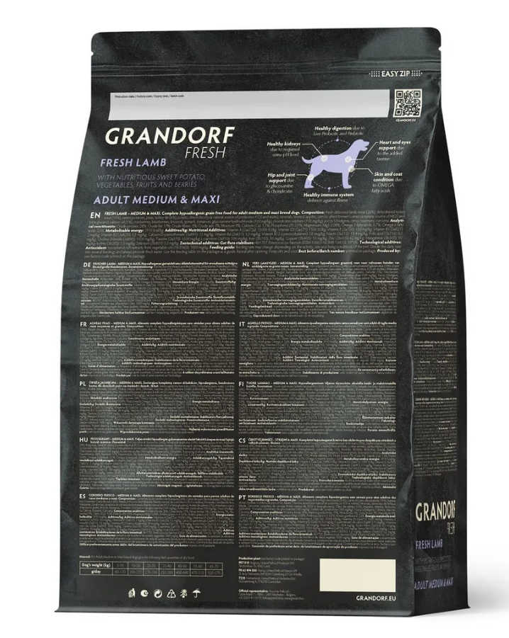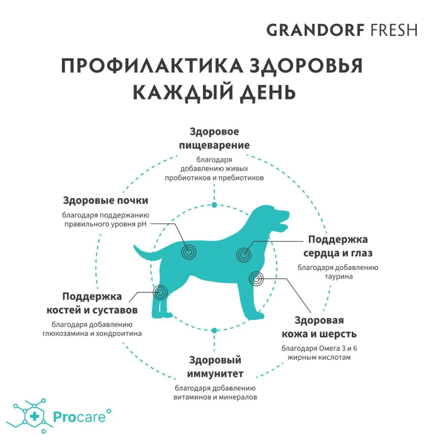 Каждый рацион Grandorf Fresh содержит один миллиард живых и полезных пробиотиков на один килограмм корма. Пробиотики поддерживают микрофлору кишечника, помогают усвоению питательных веществ и укрепляют иммунитет. Пробиотики добавляются после производства в специальных кишечнорастворимых микрокапсулах, остаются живыми и выполняют свои функции.