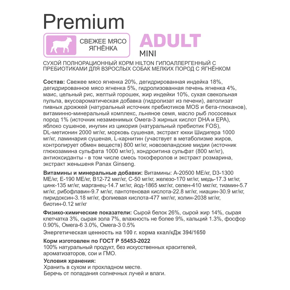 Сухой корм HILTON для собак мелких пород с ягненком.
